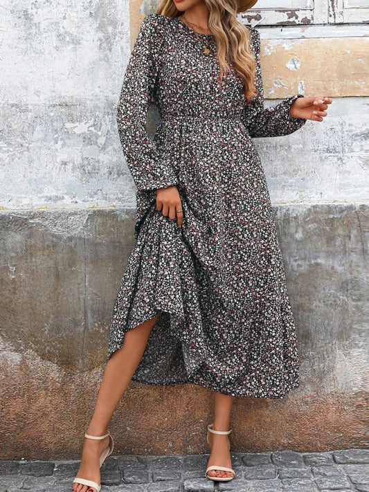 Printed Long Sleeve Midi Dress with Elastic Waist