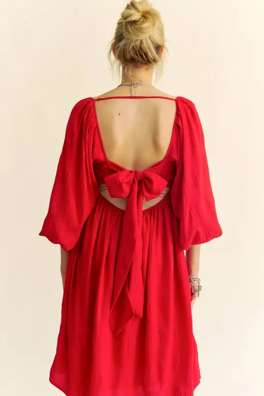 Davi & Dani Solid Textured Fabric Puff Sleeve Tie Back Dress