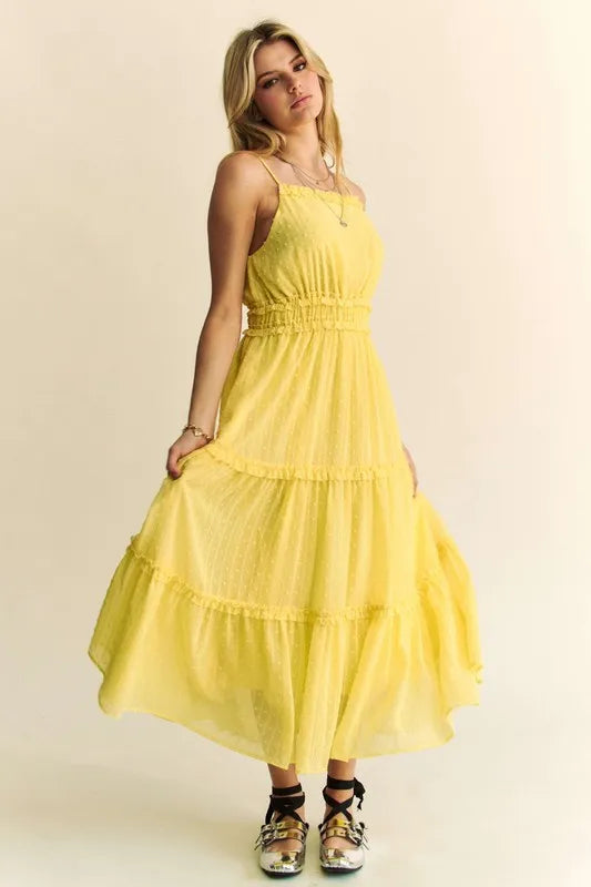 Davi & Dani Texture Swiss Dot Ruffle Square Neck Midi Dress